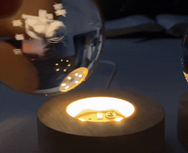 Einfach auf den Holzsockel stellen, per USB anschließen – und das Motiv beginnt zu leuchten.