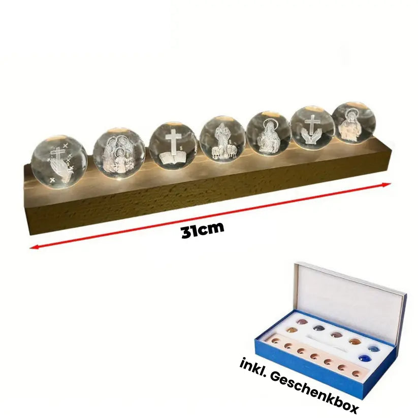 Unsere leuchtende Glaubensleiste vereint mehrere hochwertige 3D-Kristallkugeln auf einem eleganten Holzsockel.